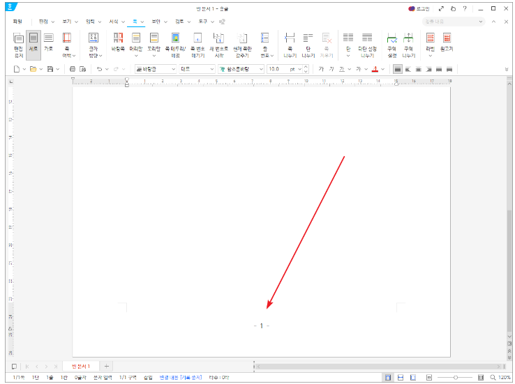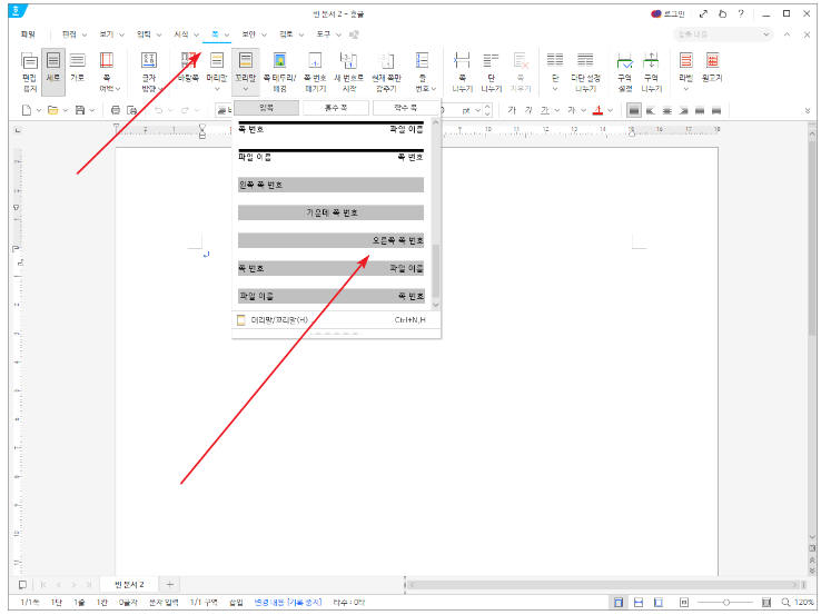 1. [쪽]의 [쪽 번호 매기기]를 선택.