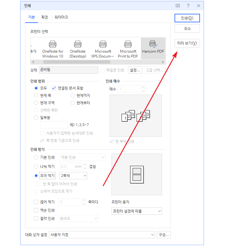 4. 아래는 두 페이지를 모아 한 장에 인쇄하는 것.