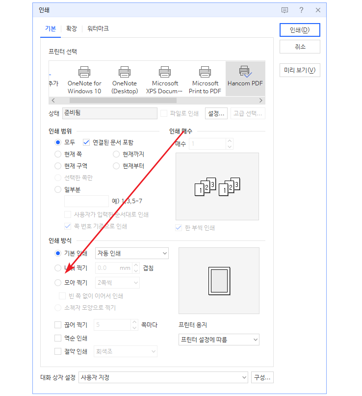 2. 하단의 인쇄 방식에서 [모아 찍기] 선택.