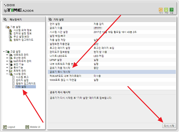 2. [고급 설정]의 [시스템 관리]의 [기타 설정]으로 이동. 그리고 [공유기 즉시 재시작]을 선택한 후 [다시 시작] 버튼을 클릭.