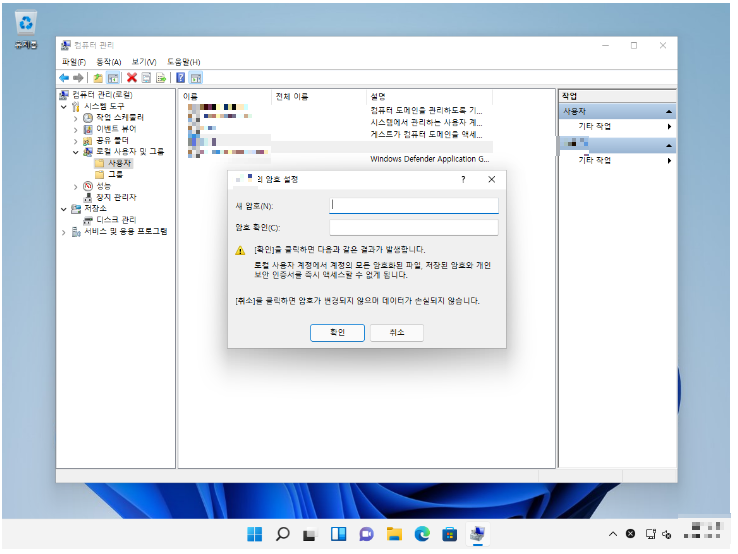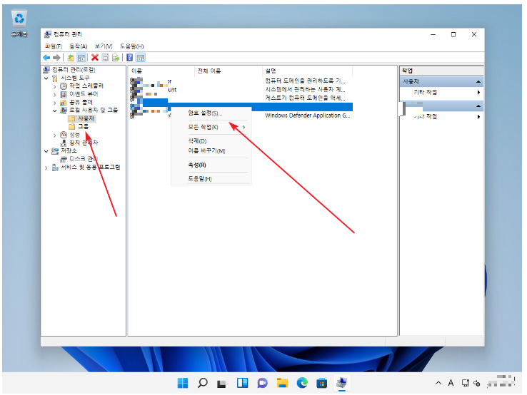 3. [로컬 사용자 및 그룹 - 사용자] 클릭해서 사용자 선택하고 마우스 우클릭.