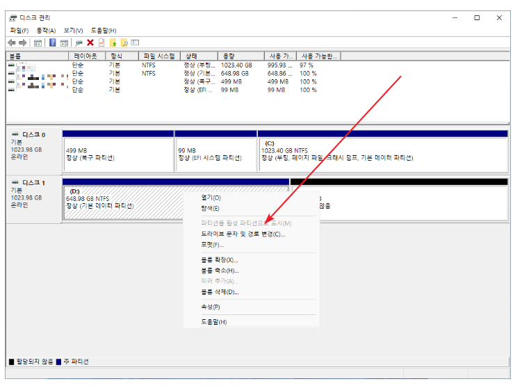 1. 드라이브 문자를 변경할 볼륨을 선택 후 우클릭.