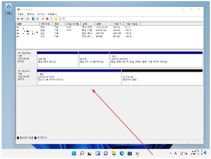 6. 디스크를 초기화하게 되면 볼륨을 만들 수 있는 공간이 만들어짐.