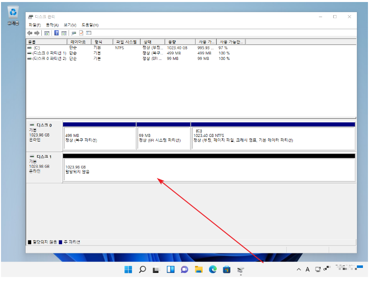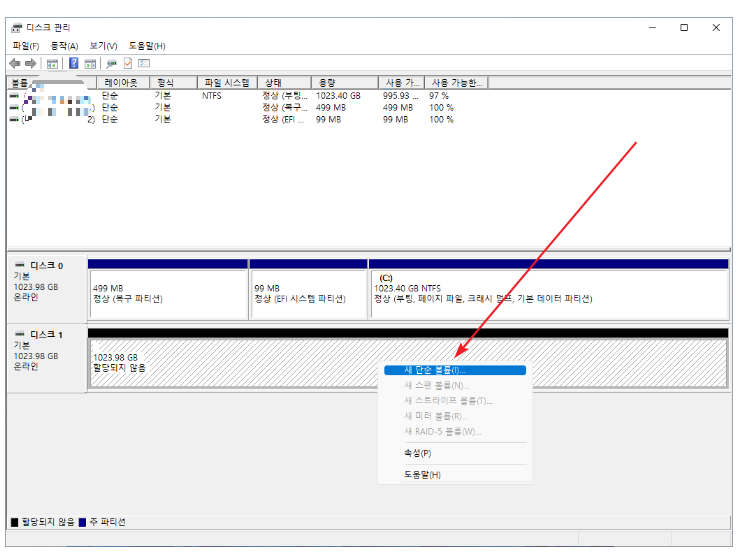 1. 볼륨을 만들 디스크 선택 후 마우스 우클릭.