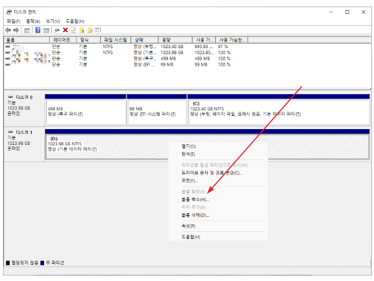 1. 디스크 관리에서 크기 변경을 원하는 볼륨을 선택 후 마우스 우클릭.