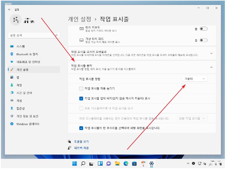 2. [작업 표시줄 동작 - 작업 표시줄 정렬] 중 [가운데] 선택 후.